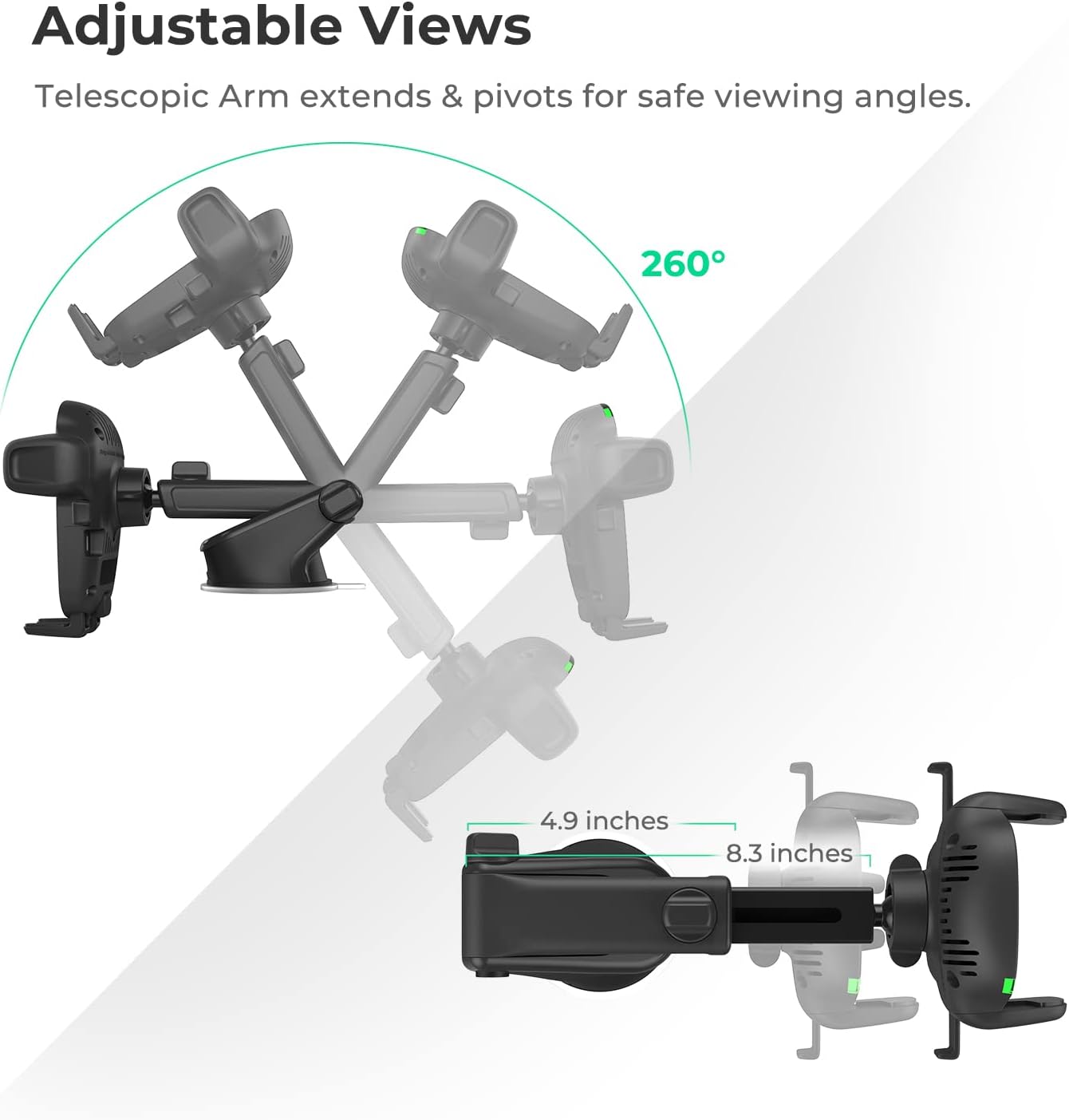 - Adjustable Bottom Foot: The foot of the mount can be raised and lowered to accommodate phones of various sizes. This helps to align the Qi coils for an efficient charging experience.