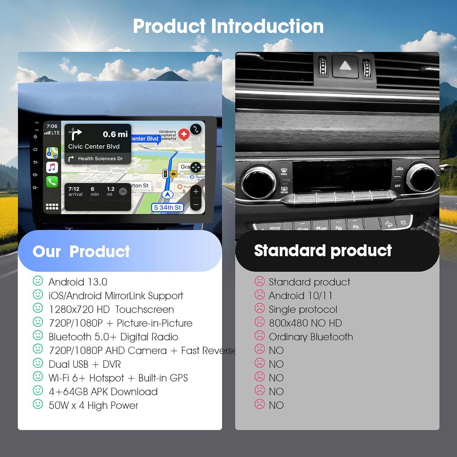 - 【Seamless CarPlay & MirrorLink Connectivity】Enjoy effortless integration with CarPlay and Android/iOS MirrorLink, ensuring smooth smartphone mirroring for navigation, calls, and app control on the 1280x720P HD capacitive touchscreen.